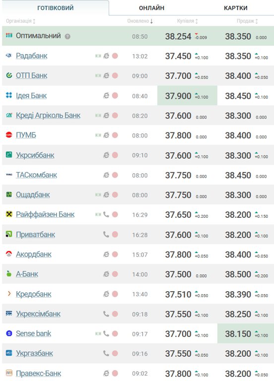 За даними порталу Minfin, в обмінних пунктах теж змінилась вартість іноземної валюти. Зараз долар коштує у купівлі 38,25 грн (+0,05), у продажу — 38,35 грн (0,05). Євро у купівлі становить 41,72 грн (+0,07), у продажу — 41,90 грн (+0,05).