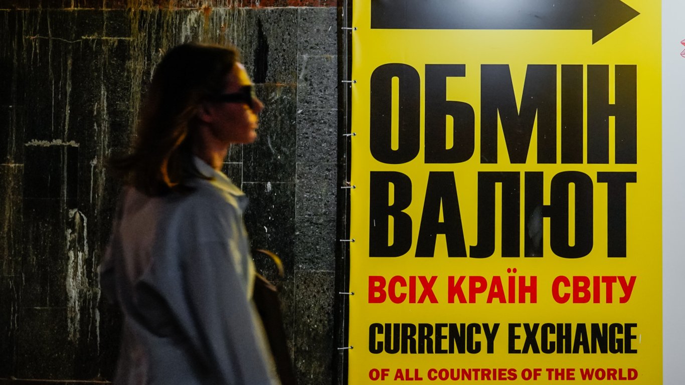 Жінка проходить біля таблички пункту обміну валют. Фото: Новини.LIVE/Ігор Кузнєцов